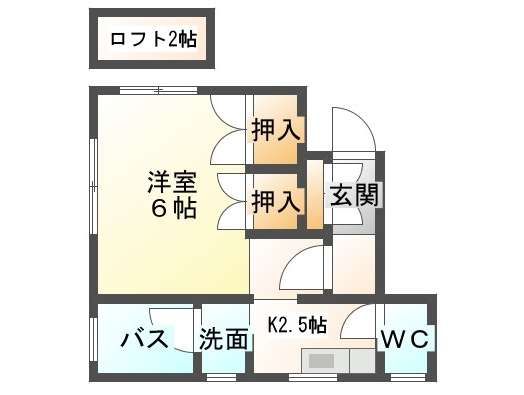 | 詳細間取 | 1K (洋6帖×1、キッチン2.5帖、ロフト2帖) | ||